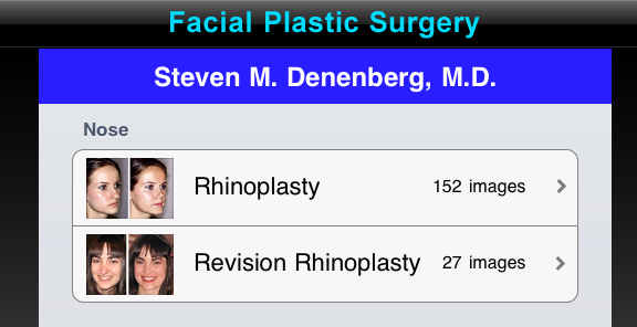 First of all, note that if you only have a few photos that you wish to put in your app, the app will still improve your practice's visibility, and it provides an easy way for potential patients to email you, send you their photos, and set up an appointment. You don't need a million photos to have a nice app. Below, we see the top of the main table of contents page. This page scrolls. Each line in the table contains a tiny thumbnail photo and the name of the photos in that category (one line is circled in red below). When the user touches anywhere along that line, he is taken to the photos. Touching within the red oval below takes the user to the Rhinoplasty photos.